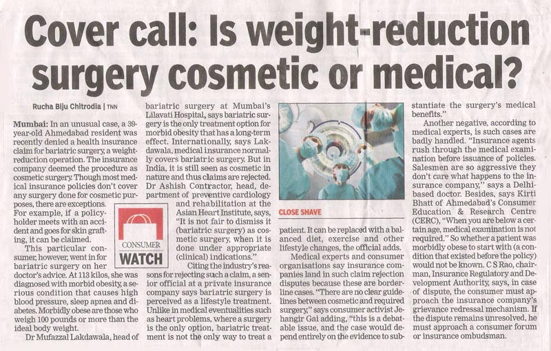 Times of India - 6 th July 2007 - Cover call: Is weight-reduction surgery cosmetic or medical?
